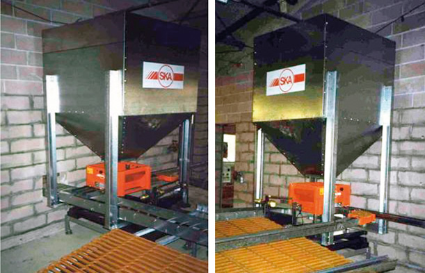 El sistema de báscula para pesar alimento SKA® se puede acoplar con la tolva compacta de línea plana (1-4 vías), o con arranque (unidades de 1 a 2 salidas)